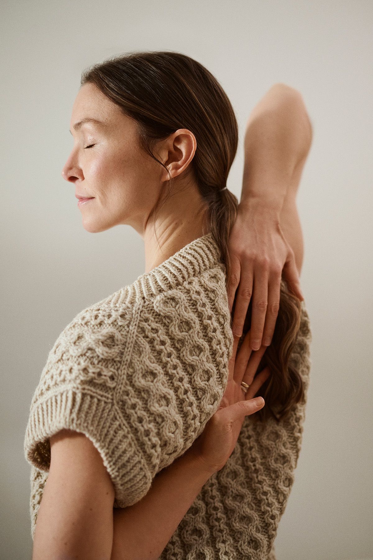 Этот вязаный спицами жилет, созданный финским дизайнером Минной Метсанен, — настоящий шедевр с прекрасными узорами из кос, образующими почти медитативный ритм — словно мантра самой вязальщицы, петля за петлей.